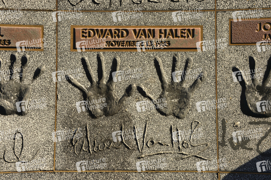 Handabdrücke von Edward 'Eddie' Van Halen am Rock Walk vor dem Guitar Center am Sunset Boulevard - Die Straßen von Los Angeles sind menschenleer. Kinos und Theater sind geschlossen. Kalifornien ist der Staat der USA mit den meisten Covid-19-Todesfällen. Los Angeles, 06.03.2021