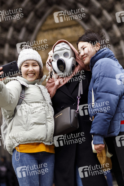 Touristen in Köln, wo nun der erste Coronavirus-Fall von Sars-CoV-2 bzw. Covid-19, bekannt wurde, posieren scherzhaft für ein Selfie mit einer Gasmaske am Kölner Dom. Köln, 29.02.2020