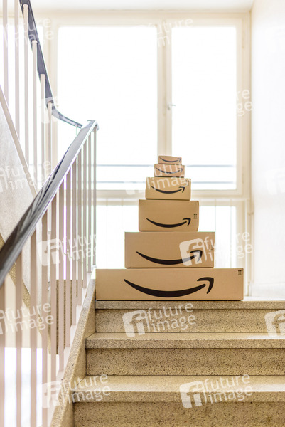 Abgestellte Amazon-Pakete in einem Treppenhaus - Einer der wenigen großen Gewinner der Coronakrise ist der Logistikriese Amazon. Die Gewerkschaft ver.di versucht seit April 2013, einen Tarifvertrag durchzusetzen, der die Löhne denen des Einzelhandels anpasst. (Sympoldbild, Themenbild) Nürnberg, 14.01.2021
