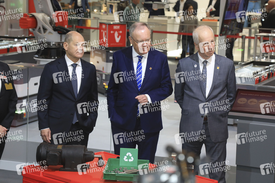 Olaf Scholz, Stephan Weil und Stephane Dion am Stand der Firma SEW Eurodrive beim Eröffnungsrundgang auf der Hannover Messe 2025 auf dem Messegelände. Hannover, 31.03.2025