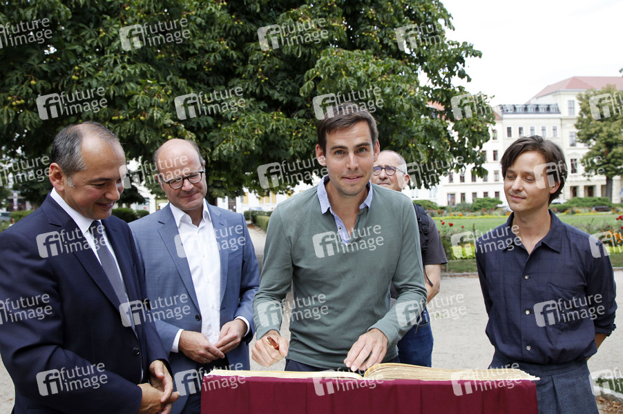 Octavian Ursu, Oliver Schenk, Felix von Boehm, Dominik Graf und Tom Schilling beim Eintrag ins Goldene Buch der Stadt Görlitz und beim Setbesuch zum Kinofilm 'Fabian - Der Gang vor die Hunde' am Wilhelmsplatz. Görlitz, 09.08.2019