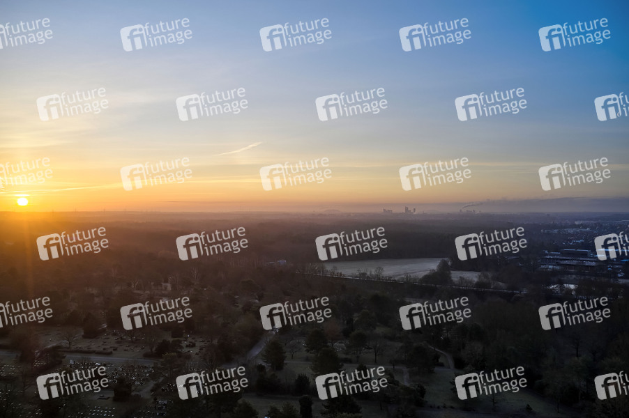 Luftbild Sonne (Aufgang 6:51 Uhr) und Mond (Aufgang 4:51 Uhr) treffen am Himmel zusammen. Hannover, 08.03.2021