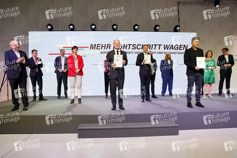 Norbert Walter-Borjans, Rolf Mützenich, Lars Klingbeil, Saskia Esken, Katrin Göring-Eckardt, Olaf Scholz, Christian Lindner, Volker Wissing, Anton Hofreiter, Robert Habeck, Annalena Baerbock und Michael Kellner beim Pressetermin zur Unterzeichnung des Koalitionsvertrages zwischen SPD, Bündnis 90/Die Grünen und FDP im Futurium. Berlin, 07.12.2021