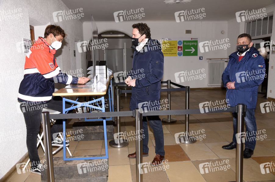 Bürgermeister Andreas Bukowski und Bürgermeister Klaus Korneder bei der Pressebesichtigung des Impfzentrum Haar und der Mobilen Einheit des Impfzentrum Oberhaching in Haar, 15.12.2020