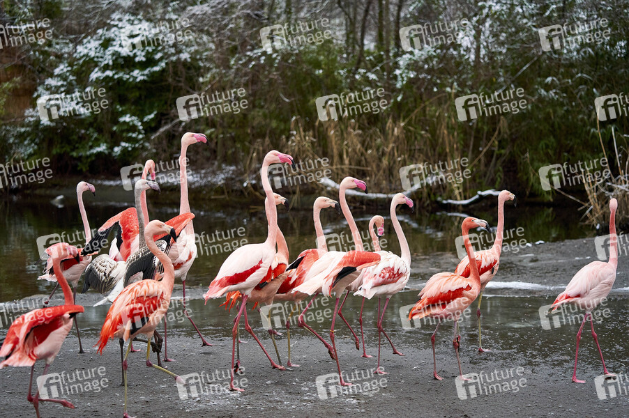 Flamingos bei der Inventur zum Jahresbeginn 2021 im Erlebnis-Zoo Hannover. Hannover, 14.01.2021