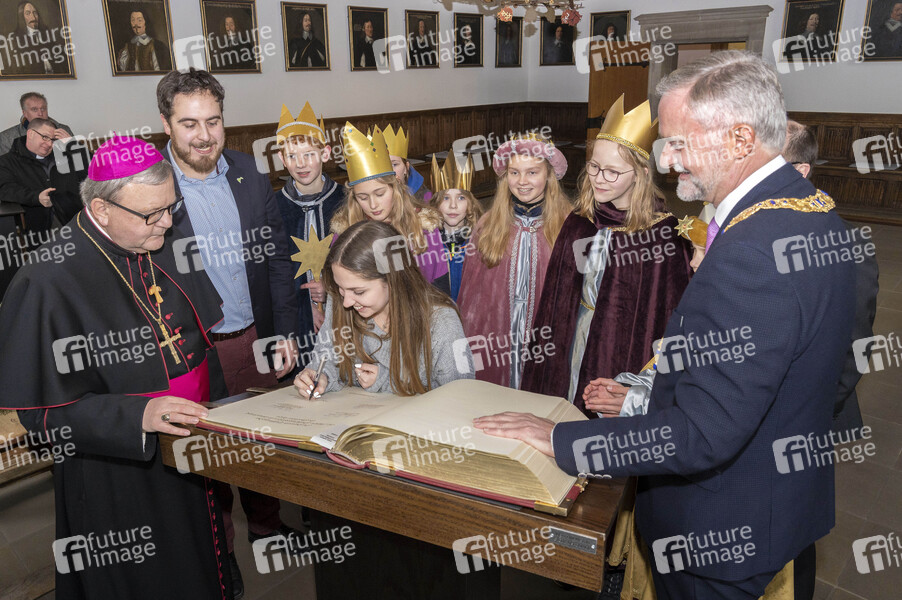 Bischof Franz-Josef Bode, Sternsinger und Oberbürgermeister Wolfgang Griesert beim Eintrag ins Goldene Buch der Stadt Osnabrück bei der bundesweiten Eröffnung der 62. Aktion Dreikönigssingen unter dem Motto 'Segen bringen, Segen sein. Frieden! Im Libanon und weltweit' im Rathaus. Osnabrück, 28.12.2019