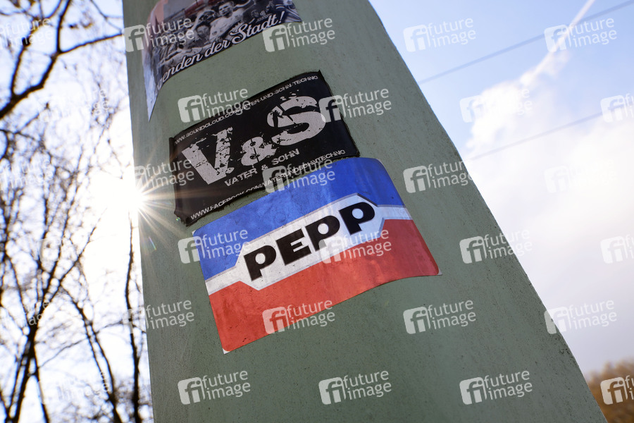 Ein Sticker mit dem verfremdeten Logo eines Discounters zeigt die Aufschrift 'PEPP' in Anlehnung an die straßengängige Bezeichnung für Amphetamine bzw. Speed. (Themenbild, Symbolbild) Köln, 31.10.2021