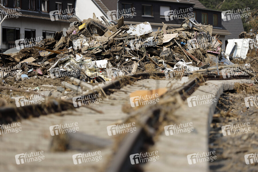 Nach dem Jahrhunderthochwasser in der Eifel durch heftige Regenfälle und Dauerregen mit Überschwemmungen und Überflutungen haben die Aufräumarbeiten im Ahrtal begonnen. Einheiten von Polizei, THW, Bundeswehr und Feuerwehr mitsamt vielen freiwilligen Helfern räumen Straßen, entfernen Schutt und Schlamm und versorgen die Menschen. Im Bild zerstörte Bahngleise in der Ortschaft Dernau, in der die Flut viele Häuser zerstörte, 22.07.2021