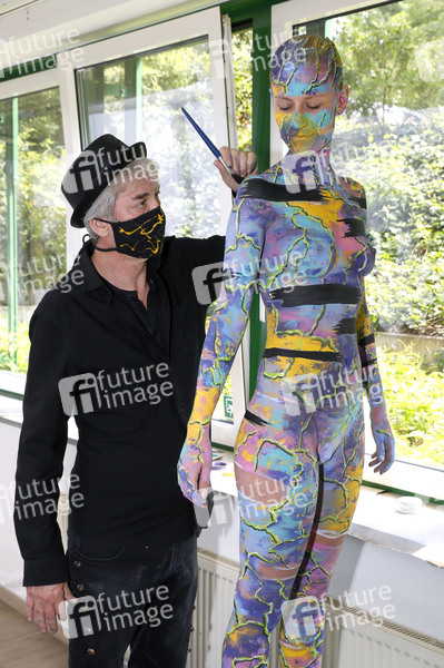 Jörg Düsterwald, einer der bekanntesten Bodypainting- und Bodyartkünstler Deutschlands macht auf seine ganz eigene Art auf die prekäre Situation freischaffender Künstler während der Corona-Pandemie aufmerksam: Unter dem Hashtag #WirzeigenFarbe hat der Hamelner Künstler in der Produktionshalle der Druckerei QUBUS media mit seinem Model Lisa ein ausdruckstarkes Live-Bodypainting inszeniert - denn Künstlerinnen und Künstler wie er sehen und fühlen sich derzeit wortwörtlich 'ausgezogen bis aufs letzte Hemd'. Und nichts symbolisiert diesen bekannten Spruch besser als ein Bodypainting auf nackter Haut in einer Umgebung, in der es jeden Tag um Farbe geht. Die Live-Performance fand mit dem zeitgleichen Druckstart von Jörg Düsterwald's neuem Premiumkalender 'Bodypainting in Nature 2021' statt. Hannover, 14.07.2020