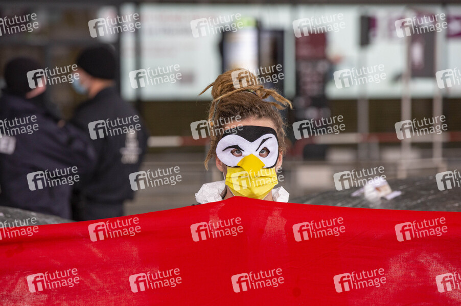 Protestaktionen von Mitgliedern des Bündnisses 'Am Boden bleiben' bei der Eröffnung des Flughafens Berlin-Brandenburg (BER). Schönefeld, 31.10.2020