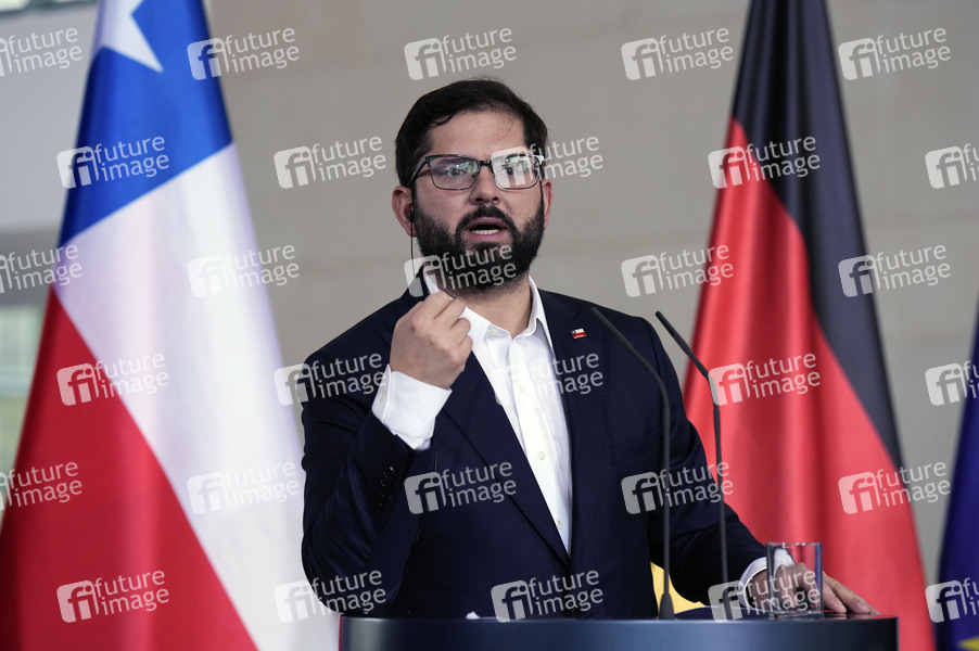 Gabriel Boric beim Empfang des Präsidenten von Chile mit militärischen Ehren und zu einem gemeinsamen Gespräch mit dem Bundeskanzler mit anschließendem Pressestatement im Bundeskanzleramt. Berlin, 10.06.2024