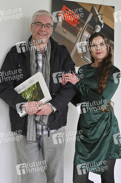 Jörg Düsterwald mit Model Tatjana Heinz beim Interview zum Fotobildband 'Bodypainting in Nature - Farbige Symbiosen' in der Radiosendung 'NDR 1 Niedersachsen - Kulturspiegel' im NDR Landesfunkhaus. Hannover, 13.02.2024