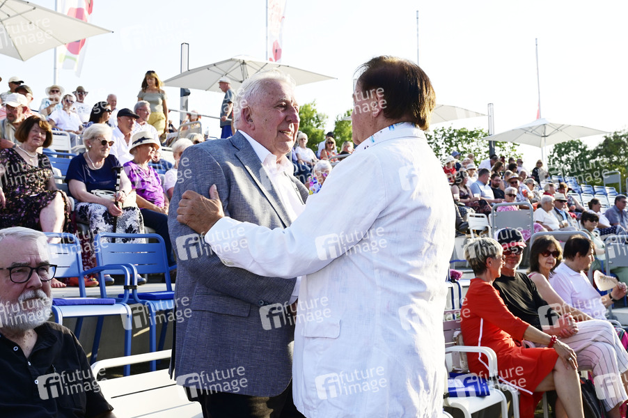 Egon Krenz und Wilfried Peetz bei der Premiere des Theaterstücks 'Maxe Baumann - Ferien ohne Ende' während der Beelitzer Festspiele 2025 auf der Freilichtbühne. Beelitz, 14.08.2025