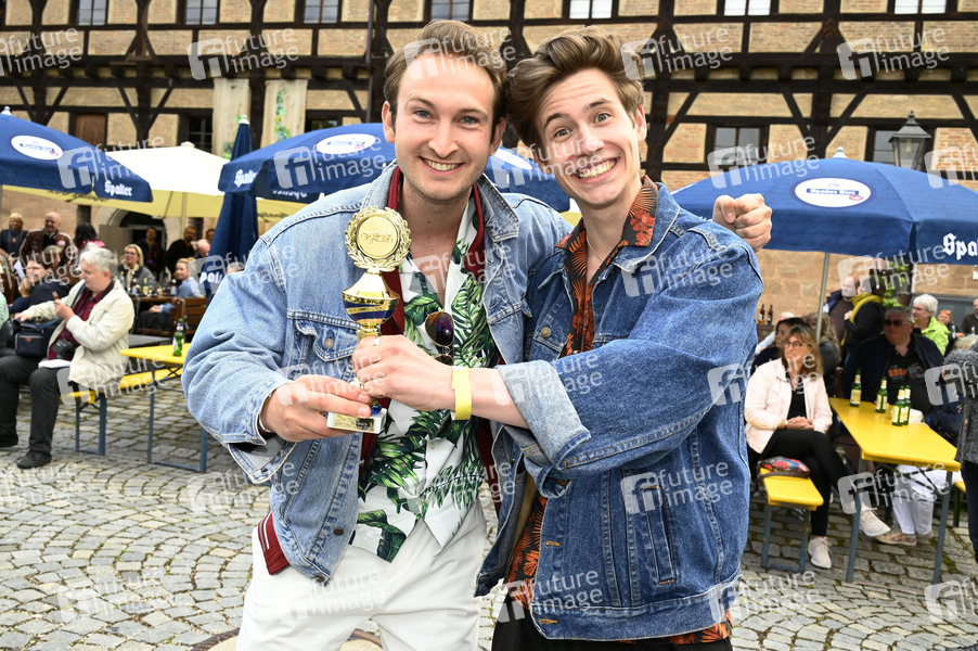 Jonathan Gertis und Adrian Bräunig bei der 4. Sternstunden Benefiz Oldtimer Rallye 2022 für geflüchtete Kinder aus der Ukraine (Spendensumme über 12.000 Euro) am Start & Ziel auf dem Kornhausplatz. Spalt, 29.05.2022