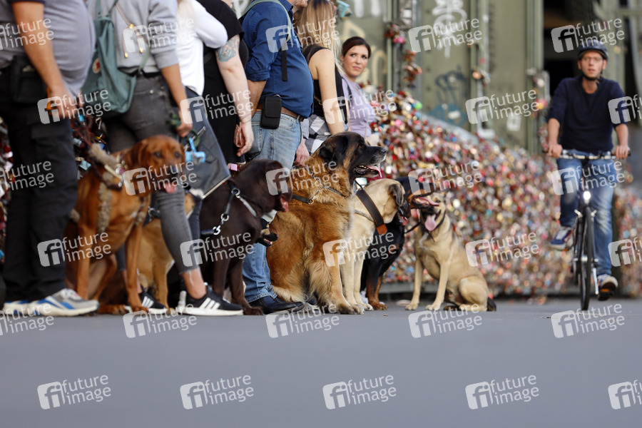 Eine Gruppe mit Hunden übt das gehorsame Führen an der Leine in der Stadt auf der Hohenzollernbrücke. (Symbolbild, Themenbild) Köln, 09.09.2020