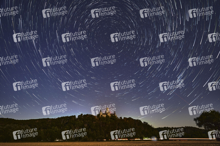 Abendhimmel am Schloss Marienburg auf dem Marienberg (Eine schriftliche Freigabe der Luftbilder durch die Pressesprecherin Annette Langhorst liegt vor). Der Startrail-Effekt entstand durch Langzeit- und Mehrfachbelichtung und zeigt die Sternenspuren duch die Erdrotation. Nordstemmen, 13.08.2022