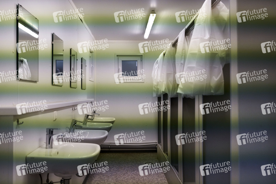 Dusch- und Toilettencontainer - Zeltdörfer-Unterkünfte für ukrainische Kriegsflüchtlinge in der Halle 27 auf dem Messegelände, inklusive Wasch- und Duschmöglichkeiten, errichtet von der Feuerwehr Hannover. Die spätere Versorgung erfolgt durch das DRK. Hannover, 06.03.2022