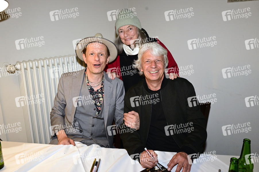 Alexander Scheer, Blanche Kommerell und Andreas Dresen nach dem Konzert 'Alexander Scheer, Andreas Dresen & Band spielen (nicht nur Gundermann) – Fernseher aus, Sternschnuppen an!' im Theater Görlitz. Görlitz, 20.03.2026