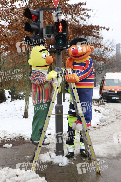 Bert und Ernie bei der Einweihung der Sesamstraße Ampelmännchen am Hugh-Greene-Weg. Hamburg, 13.01.2026