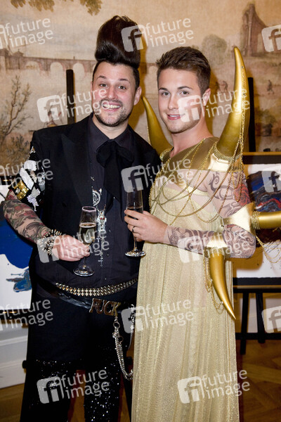 Matthias Maus und Maxim Grund beim Kunstevent zum offiziellen Verkaufsstart der Kollektion 'Glööckler Art by Borelly' mit einer Installation der Berliner Mauer und zu Kunstobjekten stilisierten Panzern im Schloss Friedrichsfelde. Berlin, 23.10.2013
