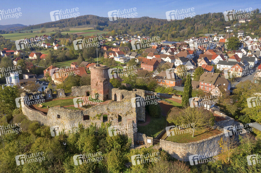 Eversteiner Burg, Sehenswürdigkeit an der Weser, Ruine, Höhenburg, Luftaufnahme, erste Erwähnung 1285