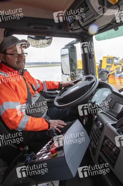 Im Schneeräumfahzeug beim Presse-Fototermin zum Winter-Fuhrpark des Flughafens Köln Bonn Airport. Köln, 11.12.2019