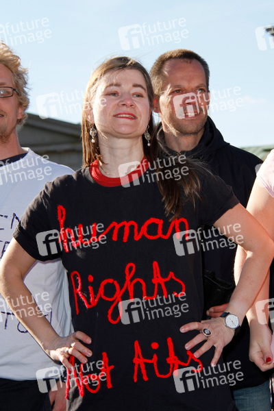 Flüchtlinge und Aktivisten, die vor dem Brandenburger Tor für eine neue Asylpolitik demonstrieren, werden von Politkerinnen der Piratenpartei unterstützt, Berlin