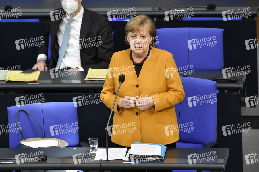 Angela Merkel in der 217. Sitzung des Deutschen Bundestages im Reichstagsgebäude. Berlin, 24.03.2021