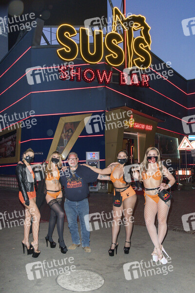 Kalle Haverland mit Tänzerinnen beim Reopening von Susis Show Bar am Beatles-Platz. Hamburg, 21.05.2020