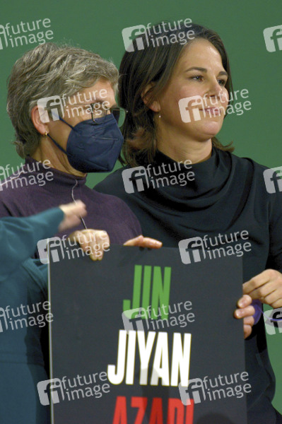 Britta Hasselmann und Annalena Baerbock bei einer Solidaritätsbekundung mit den Frauen bei den Protesten im Iran bei der 48. Ordentlichen Bundesdelegiertenkonferenz von Bündnis90/Die Grünen im World Conference Center. Bonn, 15.10.2022