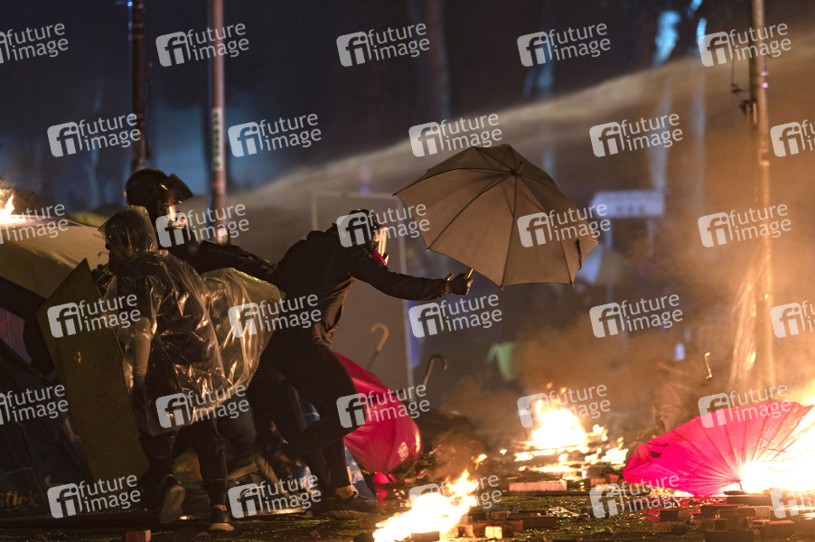 Studenten schützen sich mit Regenschirmen vor den Wasserwerfern auf der Cheong Wan Road - Belagerung an der Polytechnischen Universität. Die Polizei umstellt den Campus der Universität, nachdem Demonstranten den Cross-Harbor-Tunnel und die Hauptstraße außerhalb des Campus blockiert haben. Hongkong protestiert seit fünf Monaten ununterbrochen. Am Montag, dem 11. November 2019, begann ein Streik in der ganzen Stadt, der Teile von Hongkong zum Erliegen brachte, als MTR-Stationen geschlossen und mehrere Straßensperren errichtet wurden. Hongkong, 18.11.2019