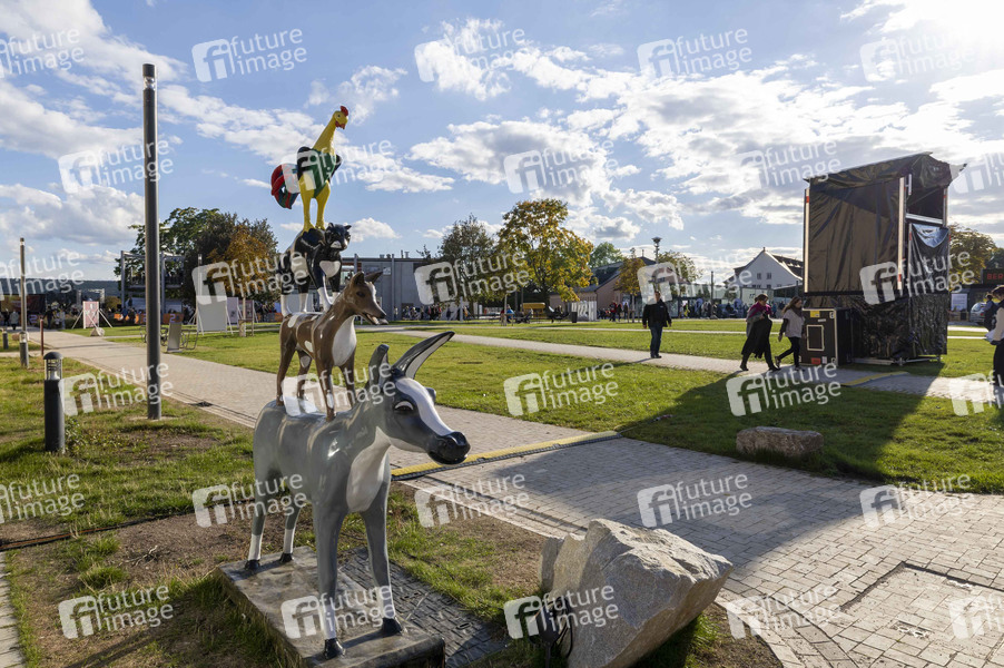 Die Bremer Stadtmusikanten am Stand von Bremen auf dem Petersberg bei dem Vorbereitungen zum Tag der Deutschen Einheit unter dem Motto 'Zusammen wachsen'. Erfurt, 30.09.2022