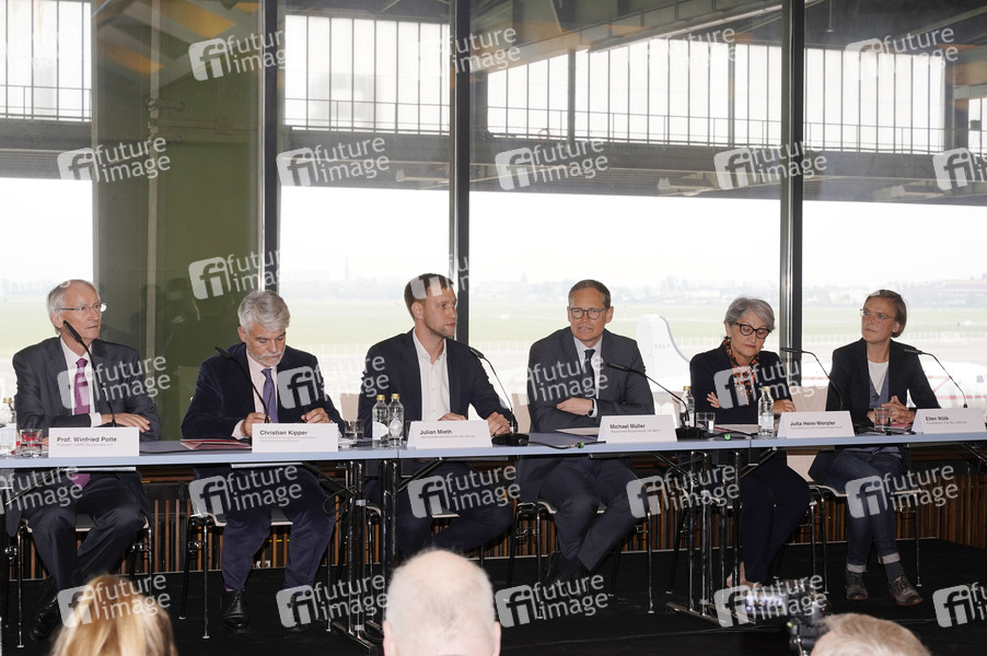 Winfried Polte, Christian Kipper, Julian Mieth, Michael Müller, Jutta Heim-Wenzler und Ellen Wölk bei der Programm-Pressekonferenz zum 'Fest der Luftbrücke' im Flughafenrestaurant des Flughafen Tempelhof. Berlin, 29.04.2019