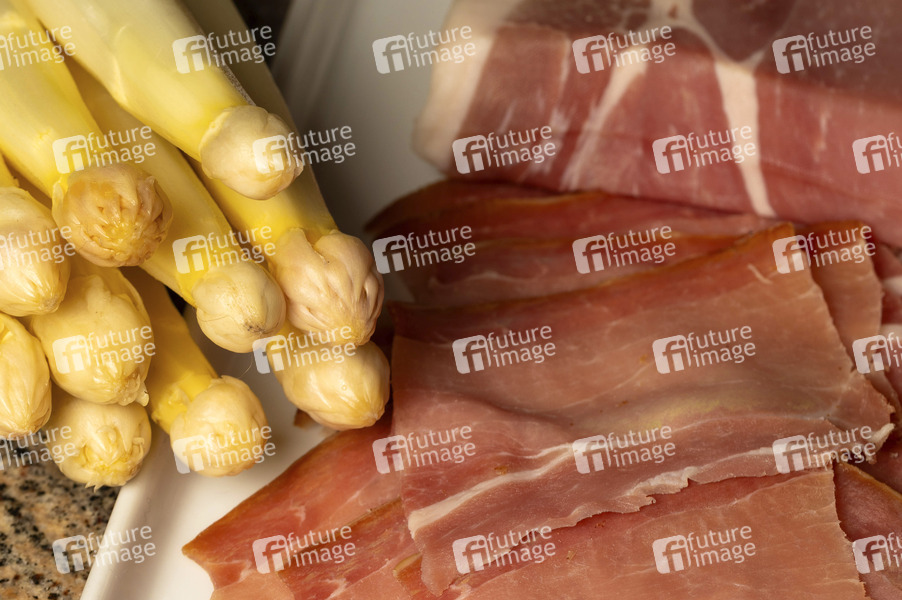 Ernährung, Malzeit, Essen, Lebensmittel, Nahrungsmittel, Fleisch, Schwein, Rind, Trockenschinken, Lachsschinken, Katenschinken, Haltbarkeit, pökeln, Vorderschinken, Parma-Schinken, Speck, Rohschinken, Spargel, Hinterschinken, Nitritpökelsalze, Symbolbild, Themenbild