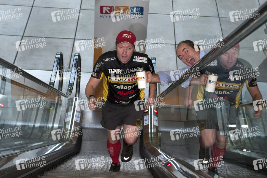 Pressetermin zum Guinness Weltrekord-Versuch. Joey Kelly will parallel zum RTL-Spendenmarathon eine herunterfahrende Rolltreppe 24 Stunden lang hochsteigen im RTL-Gebäude, Köln