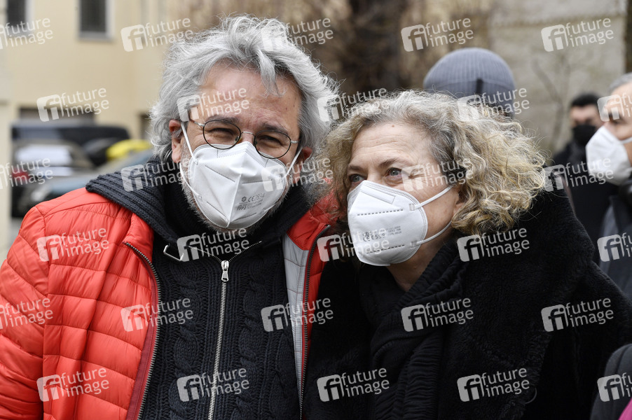Can Dündar mit Ehefrau Dilek Dündar bei der Pressekonferenz des KulturForum TürkeiDeutschland zur Solidarität mit den gesamten demokratischen Kräften in der Türkei, insbesondere mit inhaftierten Schriftsteller*innen, Künstler*innen, Journalist*innen, Gewerkschafter*innen und Politiker*innen vor dem Maxim Gorki Theater. Berlin, 23.03.2021