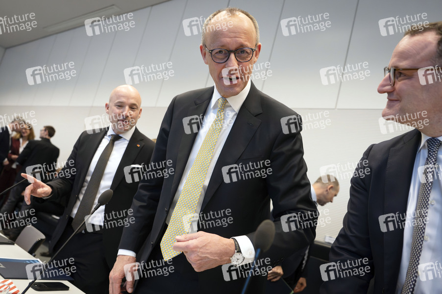 Alexander Hoffmann, Friedrich Merz und Jens Spahn in der Fraktionssitzung der CDU/CSU-Bundestagsfraktion im Reichstagsgebäude. Berlin, 24.02.2026