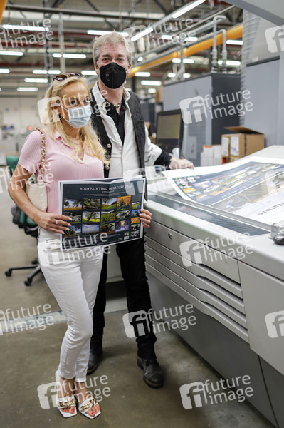 Ewa Haas Stark und Jörg Düsterwald bei der Präsentation des Düsterwald-Kalenders 'Bodypainting in Nature 2022' in der Druckerei QUBUS media. Hannover, 30.07.2021