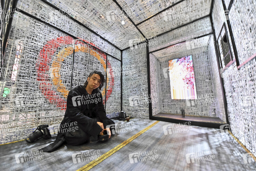 Medienkünstler Yoichi Ochiai serviert einen Tee in seinem gestalteten Teezeremonieraum 'Pla-an' aus Plastik-Spritzgussrahmen von Kunststoffmodellen während der Veranstaltung 'Gundam R Operation'. Der japanische Spielzeughersteller Bandai Spirits begann mit dem Versuch, Materialien aus Kunststoffverpackungen in Gundam-Kunststoffmodellen zu recyceln. Am 1. April 2021 startete das 'Gundam Recycling Project' mit dem Ziel, eine recyclingorientierte Gesellschaft zu bilden, indem die von Fans gesammelten 'Gundam'-Läufer (der Rahmen des Kunststoffmodells) recycelt werden. Die Menge der gesammelten Läufer wird voraussichtlich etwa 10 Tonnen pro Jahr betragen. Daher wurde das Projekt 'Gundam R Operation' mit dem Wunsch gestartet, mehr Menschen auf das 'Gundam Recycling Project' aufmerksam zu machen und das öffentliche Interesse am Recycling durch Gundam und Gunpla zu steigern. Tokio, 19.11.2021