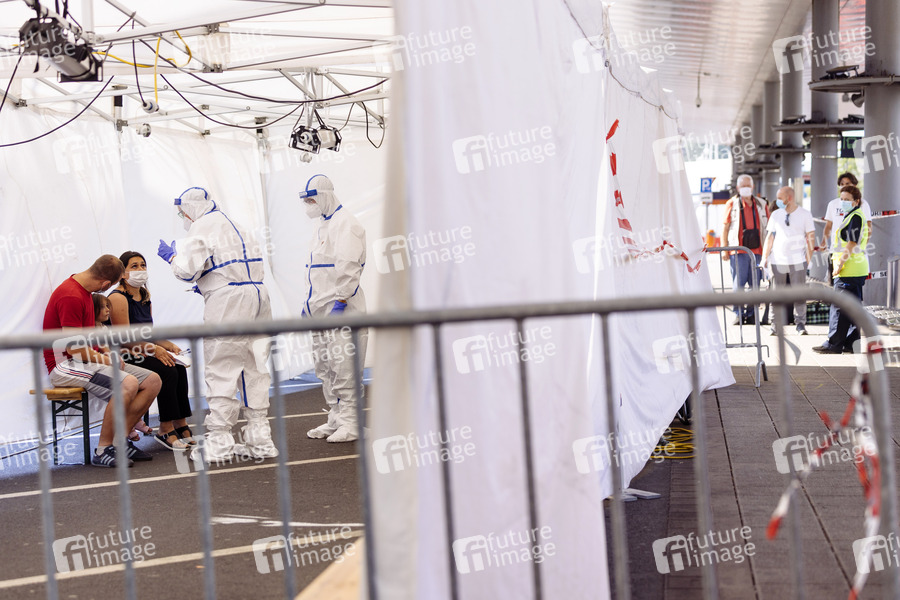 Wegen der Corona-Krise bzw. Corona-Pandemie werden im Corona-Testzentrum am Köln Bonn Airport Reiserückkehrer aus Risikogebieten auf Corona getestet. Köln, 11.08.2020