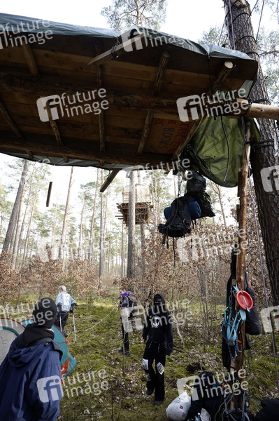 Das Protestcamp von Umweltaktivisten in Grünheide richtet sich gegen die Erweiterungspläne des Tesla-Werks. Die Aktivisten werfen Tesla vor, Umweltverstöße zu begehen, Trinkwasser zu gefährden und Abwasser-Grenzwerten zu überschreiten. Seit Donnerstag halten die Aktivisten einen Teil des Landeswaldes besetzt, den Tesla im Falle einer Erweiterung seines Geländes roden will. Sie haben um die zehn Baumhäuser in mehreren Metern Höhe errichtet und kündigten an, möglichst lange ausharren zu wollen. Auch die Bürgerinitiative Grünheide spricht sich gegen die Erweiterungspläne aus und zeigt sich mit den Besetzern solidarisch. Grünheide, 02.03.2024