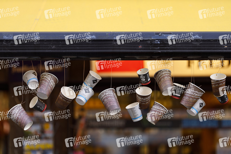 Kaffee, Coffee, Cafe, Kaffeebecher, Kaffee to go, Coffee to go, Cafe to go, Trinkbecher, Cup, Plastikmüll, Papiermüll, Müll, Wegwerfen, Müll, Müllverwertung, Basteln, Müllproduktion, Take-Away, Müllberge, Girlande, Coronakrise, Corona, Corona-Krise, Kiosk, Kioskkultur, zum Mitnehmen, Einweg, Einweggeschirr, Einwegbecher, Einweg, Abfall, Abfälle, Abfallentsorgung, Entsorgung, Abwallwirtschaft, Becherpfand, Becher, Behälter, Tasse, Coffe-to-go, Kaffee-to-go, entsorgen, Entsorgung, Pappbecher, Pappe, Umweltbewusstsein, Umweltbelastung, Verpackungen, Verpackungsmüll, Verpackungsmaterial, Wegwerfgesellschaft, wegwerfen, Wegwerfbecher, Symbolbild, Symbolfoto