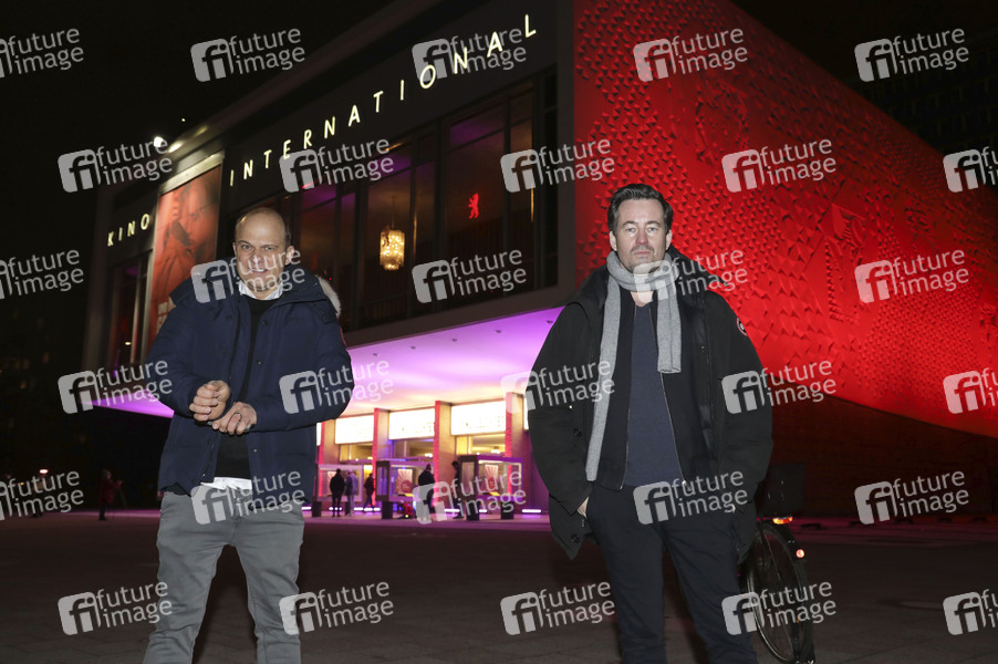 Christian Bräuer, Vorstand der AG Kino, und Christian Schwochow vor dem Kino International bei der Aktion 'Kino leuchtet. Für dich.' anlässlich der nur für die Fachwelt virtuell stattfindenden Berlinale und im Hinblick auf die Beratungen der Regierungschef:innen von Bund und Ländern über den Stufenplan zur Wiedereröffnung mit Blick auf die immer noch geschlossenen Kulturorte. Berlin, 28.02.2021
