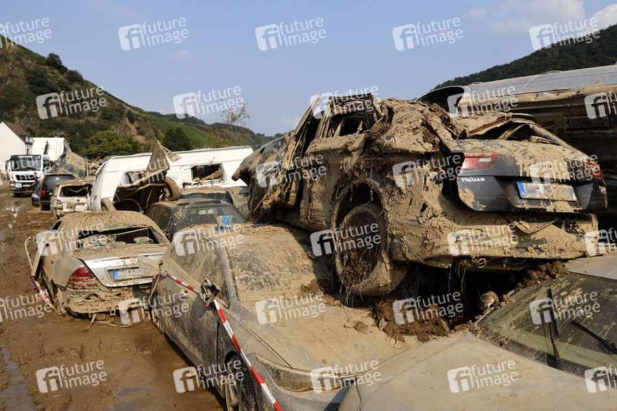 Nach dem Jahrhunderthochwasser in der Eifel durch heftige Regenfälle und Dauerregen mit Überschwemmungen und Überflutungen haben die Aufräumarbeiten im Ahrtal begonnen. Einheiten von Polizei, THW, Bundeswehr und Feuerwehr mitsamt vielen freiwilligen Helfern räumen Straßen, entfernen Schutt und Schlamm und versorgen die Menschen. Im Bild zerstörte Autos in der Ortschaft Dernau, in der die Flut viele Häuser zerstörte, 22.07.2021