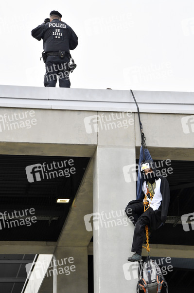 Klimaaktivisten der Aktionsgruppe 'Am Boden bleiben' protestieren gegen die Eröffnung des Flughafens Berlin-Brandenburg (BER). Schönefeld, 31.10.2020