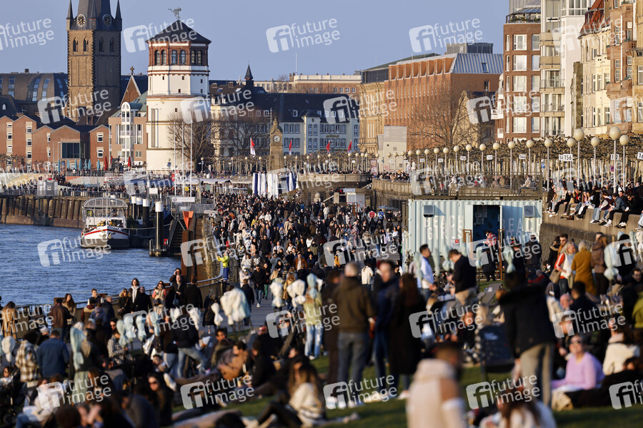 Tausende Passanten genießen die Sonnenstrahlen an der Rheinuferpromenade in Düsseldorf. Ungeimpfte können wieder mit negativem Coronatest in die Gastronomie in der Altstadt (3G). Düsseldorf, 05.03.2022