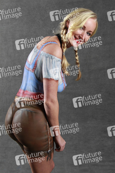 Bodypainting und Photoshooting mit Model Kathi auf einem Oktoberfest-Event in Hameln. Body Paint Künster: Jörg Düsterwald