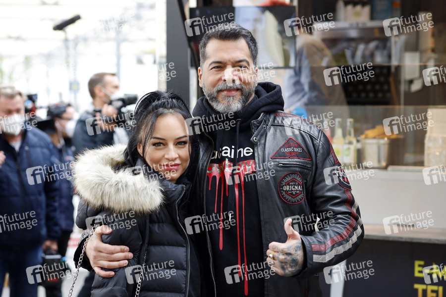 Aurelio Savina mit Freundin Larissa bei der Eröffnung von 'Willi Herren's Rievkooche Bud'. Willi Herren stellt seinen Reibekuchen-Truck am Gelände der Selgros vor. Köln, 16.04.2021
