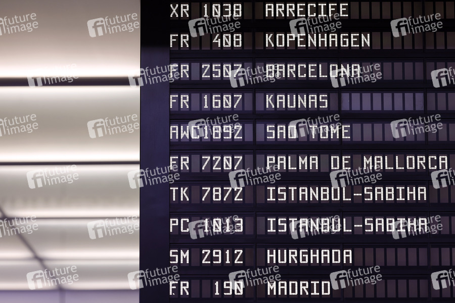 Eine Anzeigetafel mit verschiedenen Flugnummern und Zielflughäfen am Köln Bonn Airport. Der Flughafen Köln/Bonn 'Konrad Adenauer' ist ein internationaler Verkehrsflughafen in Köln. (Themenbild, Symbolbild) Köln, 23.02.2022