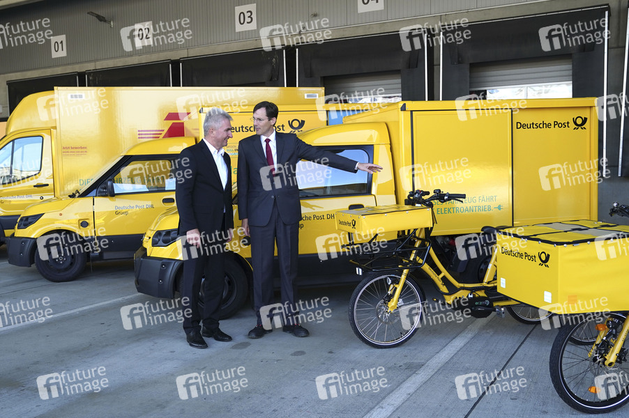 Politiker, FDP, NRW-Wirtschaftsminister, Manager, Konzernvorstand von Deutsche Post DHL Group, DHL, Deutsche Post, Deutsche Post Group, E-Mobility, Etektromobilität, E-Auto, nachhaltig, Post, Paketdienst, Elektroauto, Elektrotransporter, Umwelt, umweltfreundlich, Postzustellung, Symbolfoto, Symbolbild